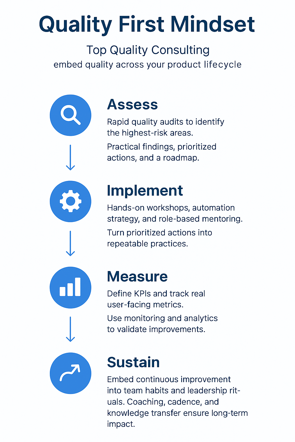 We help companies embed quality into every stage of development — from design to delivery — ensuring scalable, sustainable excellence.